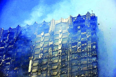 記者站在距大廈一兩百米遠的地方仰望大廈,150多米高的B座公寓樓西側和南側火勢最大,團團火苗和濃煙從墻體上升起,大火迅速向大廈內部蔓延,一個個窗戶內接連噴出火苗,大火燃燒發出陣陣響聲,并不斷掉下一些燃燒物。大火在燃燒1個多小時后,又向200多米高的A座主樓蔓延,主樓很快也燃起大火。