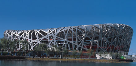 【項目簡介】:國家體育場位于北京市城府路南側,奧林匹克公園中心區內,是北京2008年奧運會的主體育場。建筑頂面呈馬鞍型,長軸為332.3m,短軸為297.3m,南北跨度結構相對標高為42.246m,東西跨度結構相對標高為69.900m,屋蓋中間開洞長度為185.3m,寬度為127.5m。主桁架圍繞屋蓋中間的開口放射形布置,與屋面及立面的次結構一起形成了"鳥巢"的特殊建筑造型。大跨度屋蓋支撐在周邊的24根桁架柱之上。主桁架盡可能直通或接近直通,并在中部形成由分段直線構成的內環。鋼結構總量約4.6萬噸,構件截面均為箱形截面,其空間位置復雜多邊,形體宏大、美觀。