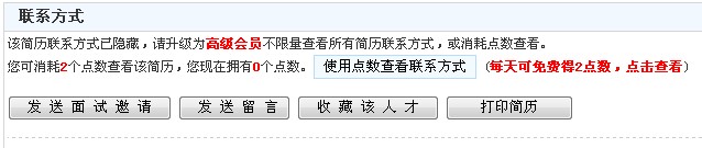 如果您只想查看簡歷聯系方式,并不需要升級高級會員,可在充值后將賬戶余額兌換為點數,1元兌換1點,查看一條簡歷的聯系方式僅消耗2點,即相當于2元錢看一條簡歷。