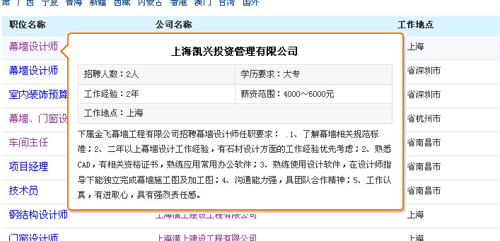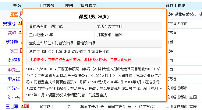 2、在“會(huì)員求職”頁面,同樣將鼠標(biāo)放到人才姓名之上就會(huì)彈出該人的簡略介紹,這樣是不是看起來很酷?