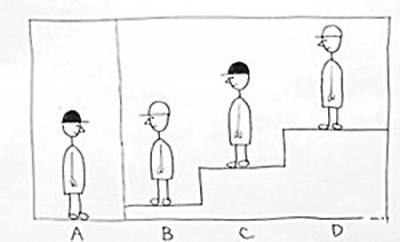 該題目被稱是“深圳某幼兒園的入學游戲題”,內容為:“如圖,在一房間里有4個小孩,2個戴黑帽,2個戴白帽,但他們都不知道自己戴的是什么顏色的帽子。A與B、C、D之間有一堵墻,所以看不見他們。同時,A、B、C、D誰都不能摘下帽子看,也不能回頭看。片刻后,4個小孩中有人猜中了自己帽子的顏色。請問A、B、C、D究竟是誰猜中了?理由是什么?”