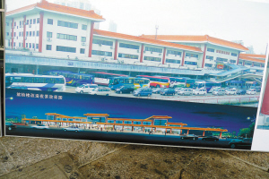皇崗口岸改造示意圖展板。其上半部為聯(lián)檢樓現(xiàn)狀,下為改造效果圖。