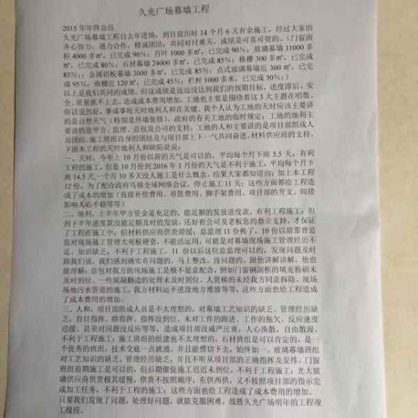 工作經歷(崗位) 1、工程名稱;陽光保險集團通州后援中心工程A座辦公樓—石材幕墻工程,發包方;中建二局第三建筑工程有限公司,建設單位;陽光人壽保險股份有限公司,監理單位;泛華建設集團有限公司,項目地址;北京市通州商務園,結構類型;石材幕墻、玻璃幕墻、鋁板幕墻、點式幕墻,規模(m2)38000,合同價格(萬元)3250,開工日期2000.9.1完工日期2002.3.15(施工員)浙江中源幕墻有限公司 2、工程名稱;陽光保險集團通州后援中心工程C座辦公樓--石材幕墻工程,發包方;中建二局第三建筑工程有限公司,建設單位;陽光人壽保險股份有限公司,監理單位;泛華建設集團有限公司,項目地址;北京市通州商務園,結構類型;石材幕墻、玻璃幕墻、采光頂、格柵,規模(m2)21000,合同價格(萬元)2400,開工日期2002.03.01,完工日期2004.08.25(施工員)浙江中源幕墻有限公司 3、工程名稱;隆鑫西城匯商業裙樓外墻裝飾及公共區域裝飾工程,發包方;重慶隆鑫隆駿房地產開發有限公司,建設單位;重慶隆鑫隆駿房地產開發有限公司,監理單位;重慶渝海建設監理有限公司,項目地址;重慶市九龍坡區火炬大道10號,結構類型;石材幕墻、鋁板幕墻、觀光電梯玻璃幕墻,規模(m2)23800,合同價格(萬元)1191,開工日期2004.10.10,完工日期2005.06.25(施工員)浙江中源幕墻有限公司 4、工程名稱;上海國際汽車城同濟科技園01A-03A項目,發包方;世百建設(集團)有限公司,建設單位;上海國際汽車城同濟科技園有限公司,監理單位;上海同濟建設工程監理咨詢有限責任公司,項目地址;嘉定區東至綠苑路、南至杭桂路、綠苑新村,北至曹安公路,結構類型;玻璃幕墻、玻璃幕墻、鋁板幕墻、雨棚,規模(m2)31200,合同價格(萬元)2752,開工日期2005.07.01,完工日期2006.11.29(項目經理)上海旭博幕墻裝飾有限公司 5、工程名稱;上海國際汽車城同濟科技園01A-03A項目2號樓排窗及窗間墻裝飾工程,發包方;百世建設(集團)有限公司,建設單位;上海國際汽車城同濟科技園有限公司,監理單位;上海同濟建設工程監理咨詢有限責任公司,項目地址;嘉定區東至綠苑路、南至杭桂路、綠苑新村,北至曹安公路,結構類型;玻璃幕墻、石材幕墻,規模(m2)16387合同價格(萬元)1311,開工日期2007.01.28 完工日期2008.12.09(項目經理)上海旭博幕墻裝飾有限公司 6、工程名稱;新城一站C地塊商業工程,發包方;上海城建市政工程(集團)有限公司,建設單位;上海城建市政工程(集團)有限公司,監理單位;上海浦東監理有限公司,項目地址;青浦新城內,結構類型;石材幕墻、玻璃幕墻、采光天棚,規模(m2)15000,合同價格(萬元)1218,開工日期2009.01.25完工日期2010.12.25(項目經理)上海旭博幕墻裝飾有限公司 7、工程名稱;三林濟陽路文化體育中心,發包方;上海浦東新區三林橋路工程有限公司 建設單位;上海浦東新區三林橋路工程有限公司,監理單位;三林濟陽路文化體育中心外裝飾工程,項目地址;三林鎮東到西營路、西到武警培訓基地、南到高青路、北到海陽路,結構類型;玻璃幕墻,規模(m2)18000,合同價格(萬元)1500,開工日期2011.5.10完工日期2012.01.20(項目經理)上海旭博幕墻裝飾有限公司 8、工程名稱;江山市江郎山游客中心及配套設施建設項目外立面裝飾工程,發包方;江山市江郎山(清漾)景區管理委員會,建設單位;江山市江郎山(清漾)景區管理委員會,監理單位;江西吉安市山市天建設工程監理有限公司,項目地址;江山市石門鎮余家塢自然村,結構類型;外立面鋼結構 玻璃幕墻,規模(m2)22000 合同價格(萬元)1780,開工日期2012.03.01,完工日期2013.01.31(項目經理)中天建設集團浙江幕墻有限公司 9、工程名稱;中國科學院上海硅酸鹽研究所多功能無機材料綜合研究基地項目發包方;揚州第五建筑安裝工程有限公司,建設單位;揚州第五建筑安裝工程有限公司,監理單位;上海振華工程咨詢有限公司,項目地址;上海市嘉定新城菊園新區,東至和碩路,北臨平城路,南至陳家山路,結構類型;石材幕墻、鋁板幕墻、陶土板幕墻,規模(m2)54000,合同價格(萬元)4544,開工日期2013.3.30 完工日期2015.05.30(項目經理)中天建設集團浙江幕墻有限公司 10、工程名稱;久光廣場幕墻工程,發包方;上海建設發展有限公司,建設單位;上海西上海建設發展有限公司,監理單位;上海建騰建筑工程監理有限公司,項目地址;嘉定區安亭鎮墨玉南路南安路,結構類型;石材幕墻、玻璃幕墻、鋁板幕墻,規模(m2)25000,合同價格(萬元)2090,開工日期2015.07.5,完工日期2016.08.31(項目經理)中天建設集團浙江幕墻有限公司 11、工程名稱;雄業金都佳園建設項目1棟幕墻工程,發包方;曲靖雄業房地產開發有限公司,建設單位;曲靖雄業房地產開發有限公司,監理單位;成都衡泰工程管理有限責任公司,項目地址;云南省曲靖市麒麟區荷花塘片區,結構類型;玻璃幕墻、鋁板幕墻、玻璃雨棚,規模(m2)26280,合同價格(萬元)2223,開工日期2016.10.16完工日期2017.12.25(項目經理)中天建設集團浙江幕墻有限公司 12、工程名稱長沙松雅湖吾悅廣場二標段外裝飾工程,發包方長沙吾悅廣場房地產開發有限公司,建設單位;長沙吾悅房地產開發有限公司,監理單位;湖南茂林建筑工程管理有限公司,項目地址;長沙市松雅湖特立路與東二路交叉口,結構類型;門窗、玻璃幕墻、鋁板幕墻、玻璃雨棚 規模(m2)16237,合同價格(萬元)1814 開工日期2017.10.16完工日期2018.08.30(項目經理)江西應科建筑有限公司。 13、工程名稱吉安市吉州區高鐵火