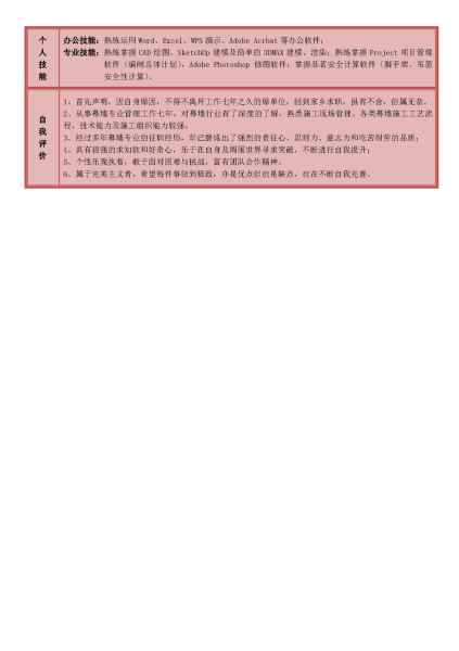 1、首先聲明,因自身原因,不得不離開工作七年之久的原單位,回到家鄉求職,雖有不舍,但屬無奈。 2、從事幕墻專業管理工作七年,對幕墻行業有了深度的了解,熟悉施工現場管理、各類幕墻施工工藝流程,技術能力及施工組織能力較強。 3、經過多年幕墻專業的任職經歷,早已磨煉出了強烈的責任心、忍耐力、意志力和吃苦耐勞的品質; 4、具有很強的求知欲和好奇心,樂于在自身及周圍世界尋求突破,不斷進行自我提升; 5、個性樂觀執著,敢于面對困難與挑戰,富有團隊合作精神。 6、屬于完美主義者,希望每件事做到極致,亦是優點但也是缺點,也在不斷自我完善。 |